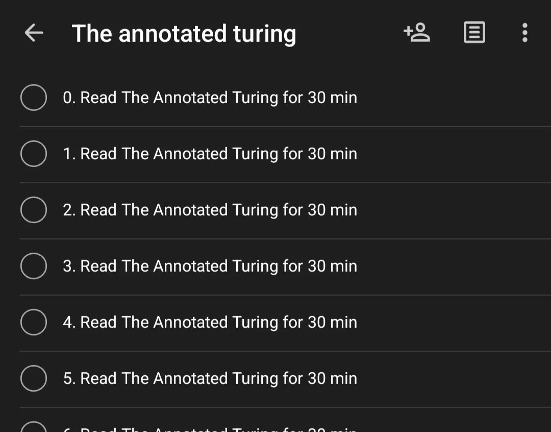 This year I was not going through any formal education. So I was a bit confused on which book to keep for Saraswati Pooja. I had a copy of The Annotated Turing, I had not yet finished reading it. The best progress I made was around two chapters. But this time around I hope I finish reading it. For motivating me I have made a todoist project with 30 minute reading chunk tracker.